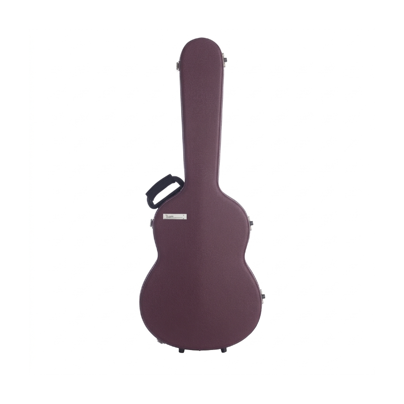 Estuche para guitarra clásica con tapa superior cubierta con piel natural y tapa inferior de aluminio cepillado.