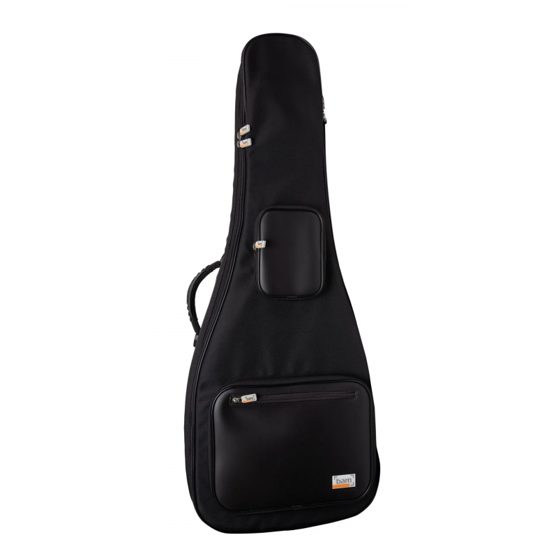 Funda para bajo eléctrico Bam Bamtech BTECH8200SN con exterior fabricado en tela con cordura negra La funda tiene un interior de terciopelo negro que mantiene la el bajo a salvo de arañazos. Una almohadilla acolchada sostiene el mástil del bajo y lo protege de posibles daños. El mástil se puede sujetar con una correa de terciopelo. La correa exterior incluye un bolsillo perfecto para guardar accesorios como púas de guitarra.
