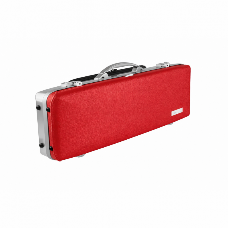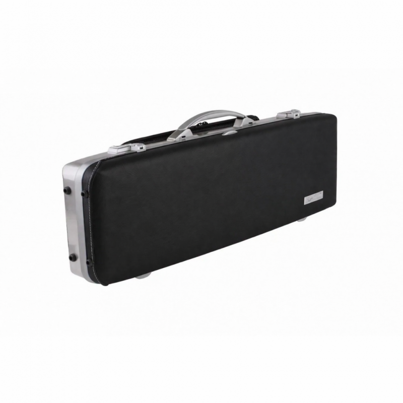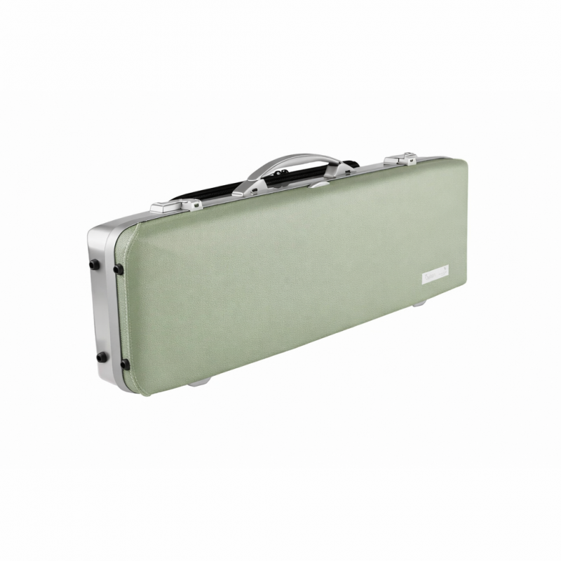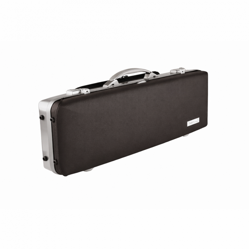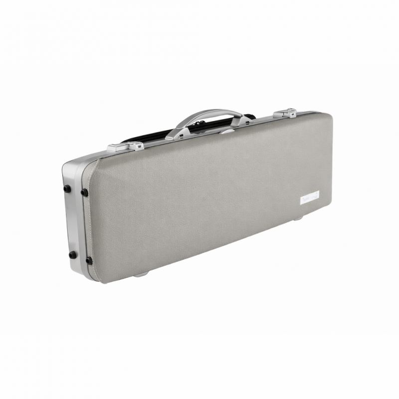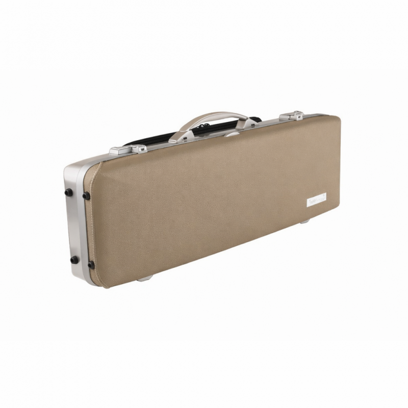 Estuche para violín de forma con tapa superior de piel natural y parte inferior en aluminio cepillado.