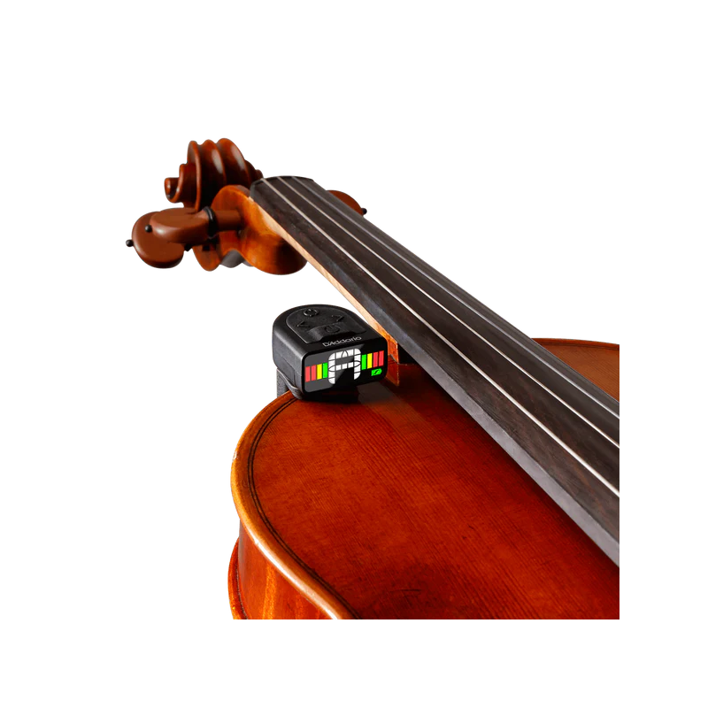 Rechargeable D'Addario clip-on digital tuner with three-color display specifically designed for violin.