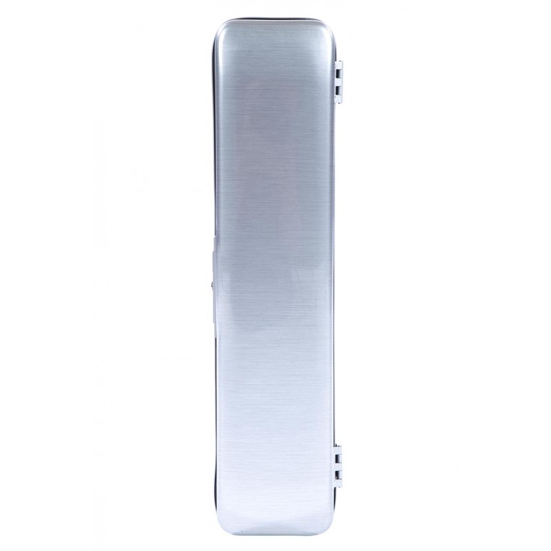 Flute case with a top lid covered in natural leather and a lower lid in brushed aluminum.