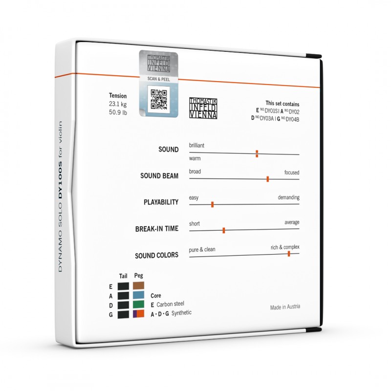 With the DY01S and DY04B strings, the set delivers a brighter and more colorful sound than the original Thomastik Dynamo set, projecting the tone with greater beauty. The DY01S E string provides a more soloistic character, complemented by the DY04B G string, whose warm tone and powerful core preserve the overall warmth of the set.